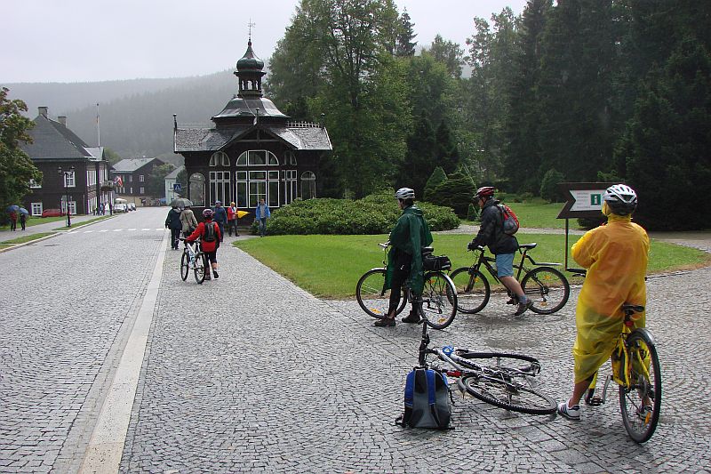Středa byla ve znamení Pradědu. Cyklobus nás vyvezl až pod Ovčárnu. Praděd nám ale ukázal odvrácenou tvář, déšť a osm stupňů. Honem dolů přes Hvězdu do Karlovy Studánky. Trochu usušit v cukrárně a přes Světlou Horu do Široké Nivy. To už nepršelo a tak cesta údolím Opavy zpět do Krnova byla příjemná. Jen hustota restaurací byla na naše kručící žaludky poněkud malá.