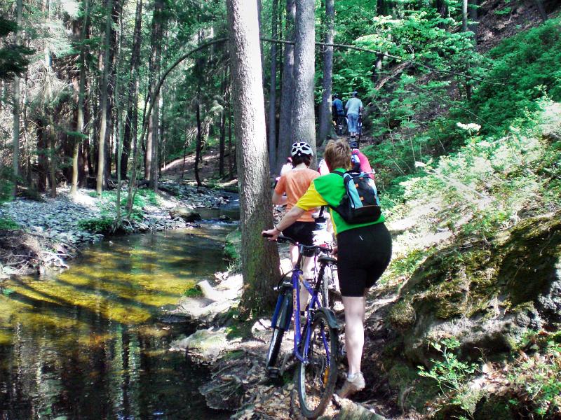 O náplni posledního dne, neděle, se rozhodlo až ráno u snídaně. Cílem byla přehradní nádrž Naděje postavená na Hamerském potoce. Nad Malevilem jsme odbočili na žlutou značku směrem na Mařeničky. Že nepojedeme po cyklostezce jsme věděli, ale proč ne, když je nebe bez mráčku. Do Mařeniček to bylo „jen“ přes kořeny stromů, do Antonínova údolí dokonce po silničce. Ale cesta od Hamru údolím Hamerského potoka pod přehradu Naděje byla jedno dobrodružství. Ozývaly se hlášky: „Už vím, proč se to jmenuje Naděje“ nebo „Jakým koeficientem si přenásobíme ujeté kilometry“. Naše kola se asi divila, když byla přemísťována přes balvany, po úzké stezičce ve výšce nad potokem nebo po kládách v bažině. Pohled na jezero přehrady, skryté v lesích však stál za tuto námahu.
