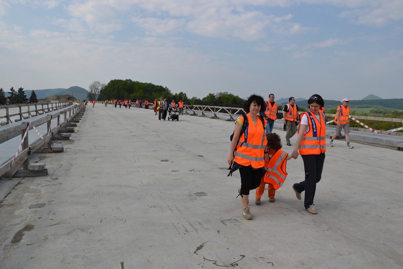 Sluníčko v sobotním ránu 30.dubna 2011 naladilo všechny optimisticky. Krátce po sedmé hodině ranní autobus Dopravního podniku města Chomutova odvezl první nedočkavce k unikátní stavbě dálničního mostu. Ředitel výstavby ing. Fuksa je odborným výkladem seznámil nejen s technickými parametry tohoto díla, ale i s peripetiemi při jeho výstavbě. Vybaveni reflexními vestami se účastníci pochodu prošli po mostovce a mohli se tak kochat neobvyklými výhledy. Po zhruba třistametrové procházce po tělese dálnice se vyznavači krás Českého středohoří rozešli po šesti připravených trasách. Nejvíce účastníků (220) se přihlásilo na nejkratší 6,5 km trasu. Neobvyklé pohledy na stavbu dálnice z 11 km trasy si vybralo 118 účastníků. Krásnou procházku rozkvetlým lesem v Portě Bohemice na trase 15 km absolvovalo 150 turistů, tradičně nižší účast byla na delší trasy (24, 30 a 50km), celkem 85 pěších nadšenců. V cíli na vrcholu Lovoše pak čekal účastníky nejen překrásný výhled, diplom a obvyklá sušenka a čaj, ale i country melodie v podání folkové skupiny Karavana. Opět se potvrdilo, že turisticky zdatnější jsou ženy (51% účastníků) i když zřejmě zájem o technický um stavitelů obvyklý rozdíl skóre ve prospěch něžného pohlaví proti dřívějším ročníkům trochu vyrovnal. Pořadatele potěšil pokles věkového průměru účastníků, nejvíce jich bylo v kategorii 31-40 let.